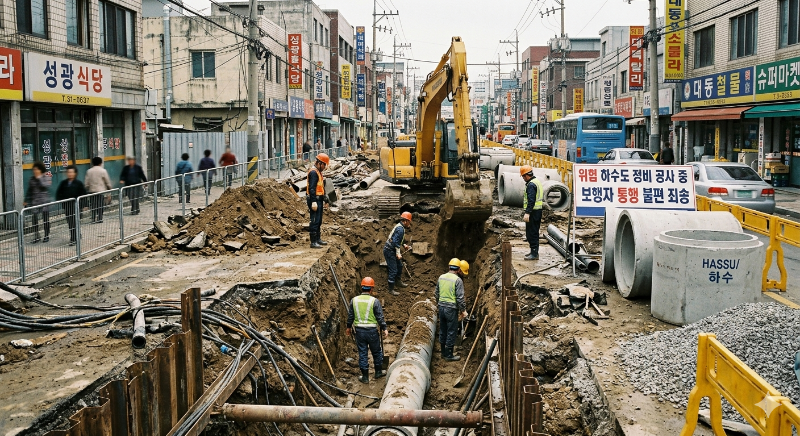 꿈속에서 '마트(공연)'는 화려하고 질서 정연한 외부 세계, 즉 네가 도달하고자 하는 목표나 사회적 역할을 의미한다. 하지만 그곳으로 가는 길은 온통 파헤쳐진 '하수도 공사' 현장이다. 하수도는 우리 마음의 보이지 않는 찌꺼기나 억눌린 감정이 흐르는 통로이다. 도로가 파헤쳐졌다는 건, 내가 정해진 길(사회적 규범이나 계획)을 따라가려 하지만, 무의식 밑바닥에 쌓여 있던 해소되지 않은 감정들이 수면 위로 올라와 나의 갈길을 가로막고 있음을 보여준다.